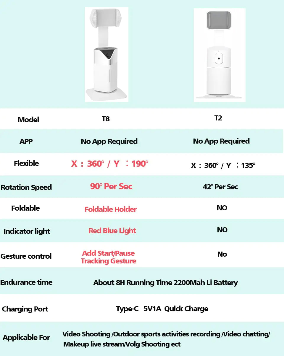Specifications:Up & Down View Angle: 105°Tracking Take: YesSupporting System: Both iOS and Android smartphonesSupport Remote Control: NoSuggest Tracking Distance: ≥ 1 mSpecial Feature: No App NeededRotation Speed: 42°/SecRotation Angle: 360°Rechargeable Battery: USB Charging PortRated Power: 5V1AProduct Weight(Oz): 7.76Product Size(inch): 7.75(H)*2.0(Diam)Best Sensing Distance: 5MBattery Life: 8hoursBattery Capacity: 2200mAh lithimun batteryBattery Life: 6-8hoursBattery Capacity: 2200mAhAuto AI Face: YesAnti-Shake: Yes360 Rotation: YesAngle: 105