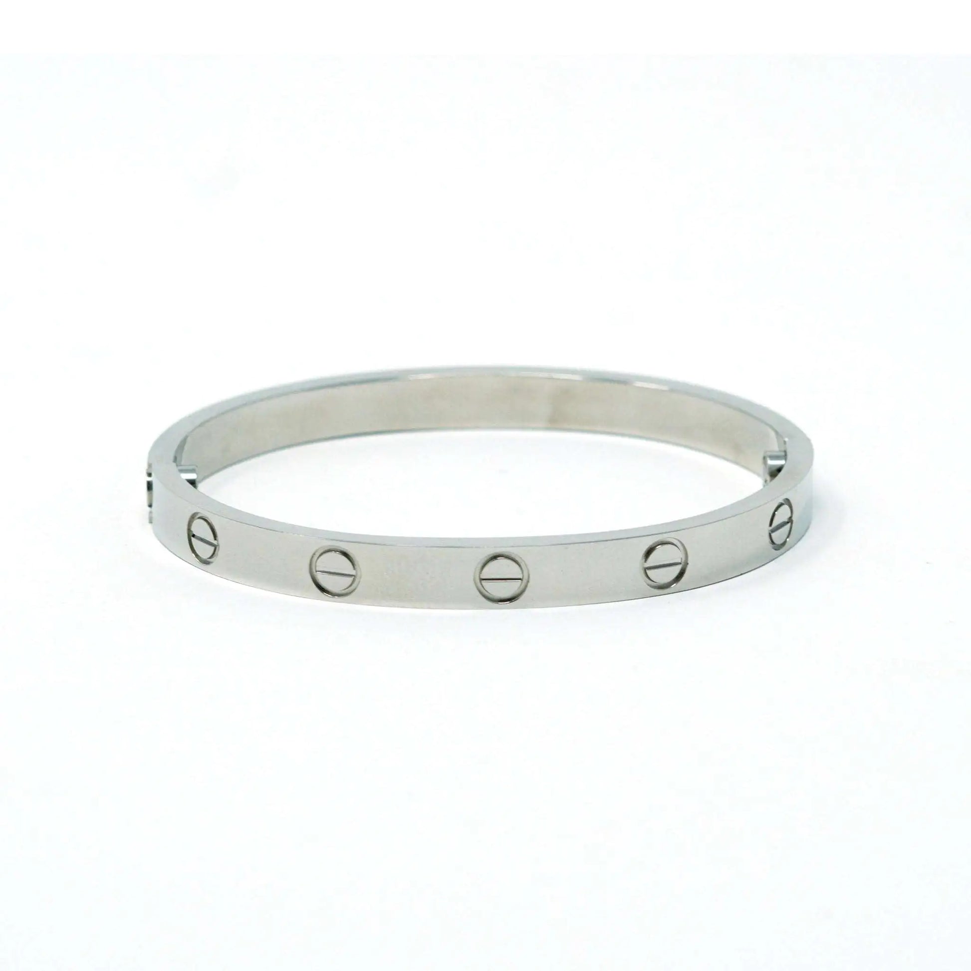 Make a bold statement with the Silver Love Bracelet, crafted from luxurious sterling silver. With its intricate design that features accents of a single screw and subtle details, this contemporary yet timeless piece is ideal for special occasions or to add sparkle to any everyday look. A sophisticated alternative to Cartier's iconic Love Bracelet, the Silver Love Bracelet has a modern take on traditional arm candy. Perfect for anyone looking for an affordable luxe bracelet, this unique accessory is sure to give you a signature look! Each bracelet is sold separately and comes with a mini screwdriver. Get your Silver Love Bracelet and make a statement today!