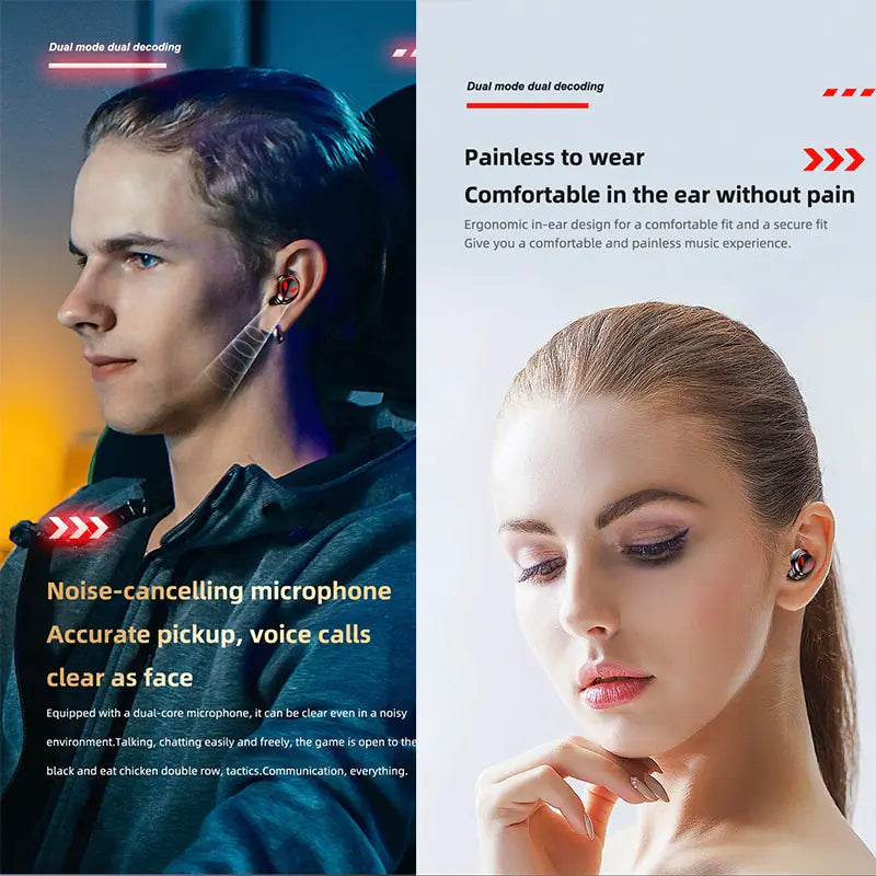 Get ready for the most advanced listening experience with TWS Wireless Headphones Gaming Headset. This headset brings you Hi-Fi stereo sound combined with low latency HD Calling and Bluetooth 5.2 connectivity — so no more moments when you’re not hearing everything on your game. The heavy bass and noise cancellation will keep your game audio clear without any distractions, while the AI three real digital display shows vital stats like battery life. Type-C charging will make sure your headphones are always charged up - fast! Plus, its no-pain design means hours of comfort in the earbud! This headphones set is also IPX6 water-resistant, so you never have to worry about spills or mishaps ruining your headset. With this professional headset, gamers can enjoy hands-free calls in beautiful HD without sacrificing performance. Get ready to maximize every gaming moment with the TWS Wireless Headphones Gaming Headset.